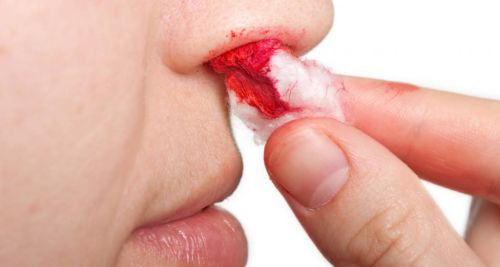 При носовом кровотечении нужно сесть прямо, слегка наклонившись вперед. В ноздри нужно поместить тампоны, смоченные перекисью водорода. К переносице приложите лед.