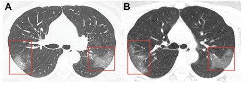Журнал Radiology опубликовал снимок легких 33-летней китаянки. Женщина была госпитализирована с температурой 39 градусов. На рентгене были множественные помутнения. Через три дня ситуация усугубилась – на втором снимке видно, что область «матового стекла» стала больше.