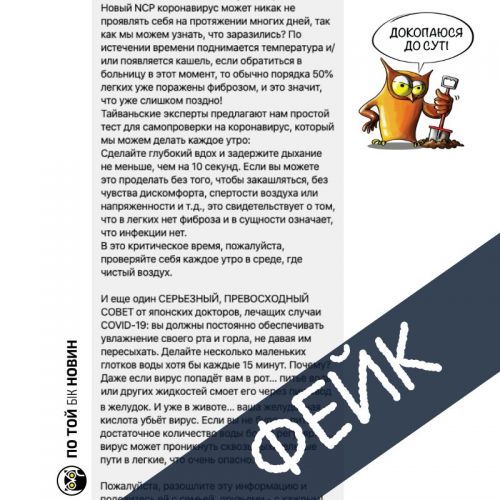 - Илья Бурлаченко, ассистент кафедры внутренней медицины № 2 Национального медицинского университета им. Богомольца заверил, что тесты с задержкой дыхания, увлажнение рта и горла и другие «советы японских докторов» или «российского врача Юры Климова» - чистой воды фейки.По той бік новин