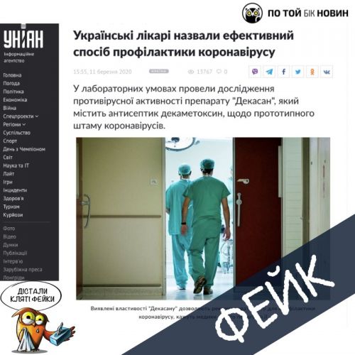 - Ну и – о недобросовестных производителях некоторых препаратов. Например, недавно в интернете появилась информация о том, что якобы «Декасан» (препарат, на самом деле не имеющий явной доказанной эффективности ни при каких заболеваниях) – это просто находка для профилактики коронавируса (нужно использовать небулайзер). Инфекционист Юрий Жигарев предостерегает: ингаляции данным препаратом запрещено проводить людям младше 18 лет. Это во-первых. Во-вторых, небулайзер действует в нижних дыхательных путях, а вирус «цепляется» к слизистой носа. Так что тоже фейк. По той бік новин