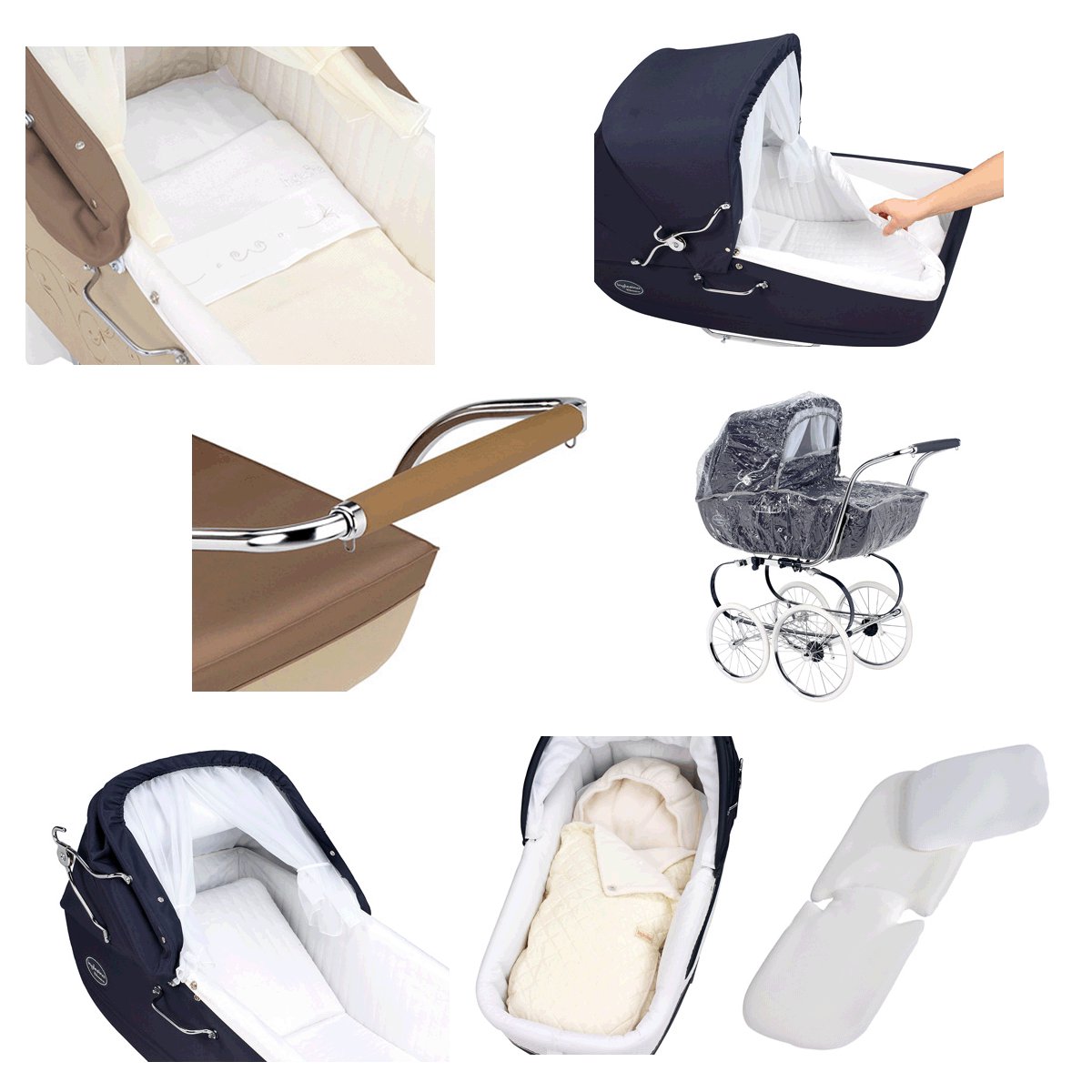 Простой механизм системы Easy Clip установки люльки или прогулочного блока. Возможность укачивания малыша. Ручка регулируется по высоте, выполнена из натуральной кожи и имеет крючки, на которые можно повесить сумку. Схема механического сложения по типу «книжки». Задний стояночный тормоз приводится в действие нажатием ногой на перекладину.