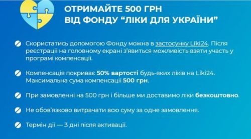 Такая компенсация стоимости лекарства – разовая и составляет до 500 грн (приобретение и доставка). Такое возмещение покрывает до 50 % стоимости любых необходимых человеку препаратов (но не дороже 500 грн). Если точнее: