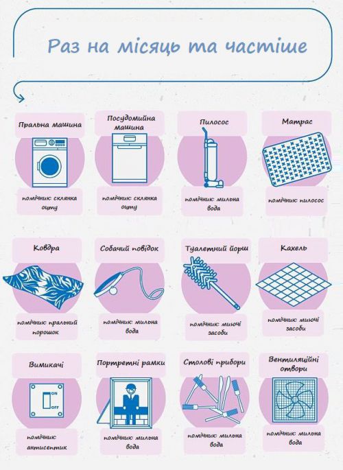 Раз в месяц промывайте стиральную и посудомоечную машину стаканом уксуса на режиме горячей стирки. Чистите также мешок в пылесосе, мойте туалетный ершик, выключатели света, рамки для картин и вентиляционные отверстия.