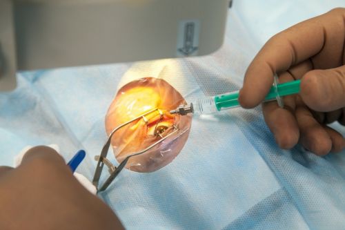 - Ингибиторы ангиогенеза. Этот метод блокирует патологический рост сосудов в сетчатке, «закрывает» их, что помогает уменьшить отек и быстро улучшить зрение. В операционной безболезненно тончайшей иглой внутрь глаза вводят лекарство. Через месяц пациент снова проходит обследование. Если есть необходимость, препарат вводится повторно. Обычно назначают три укола, но, если результат хороший сразу, достаточно и одного. Лечение макулодистрофии ингибиторами ангиогенеза показало, что это безопасно и эффективно. Поэтому такой метод сейчас применяется для лечения «влажной» формы макулодистрофии в Европе и Америке.