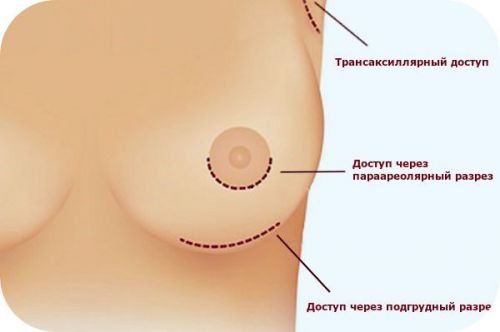 1. Подмышечный (аксилярный) - доступ в области подмышечной впадины, разрез проходит по заднему краю границы большой грудной мышцы, при этом ткани молочной железы во время операции не затрагиваются.